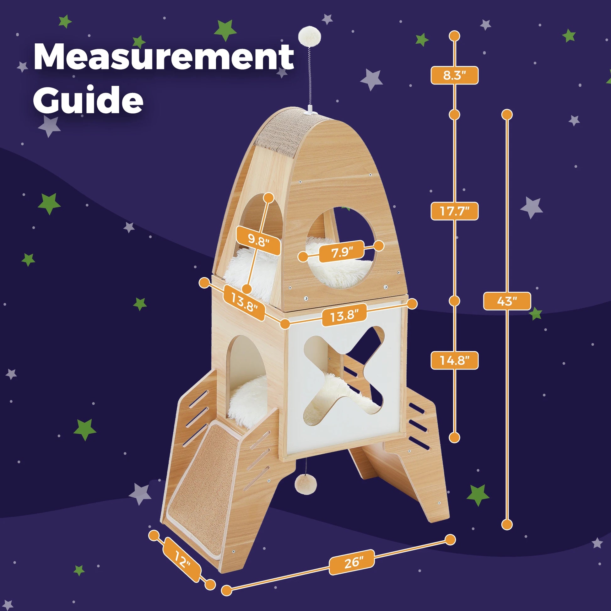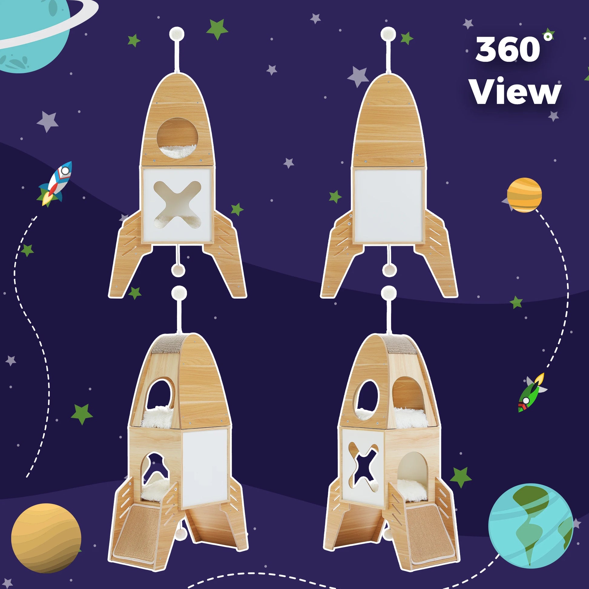 Modern Rocket Shape, Wooden Cat Tower with 2 Condos and Dangling Balls